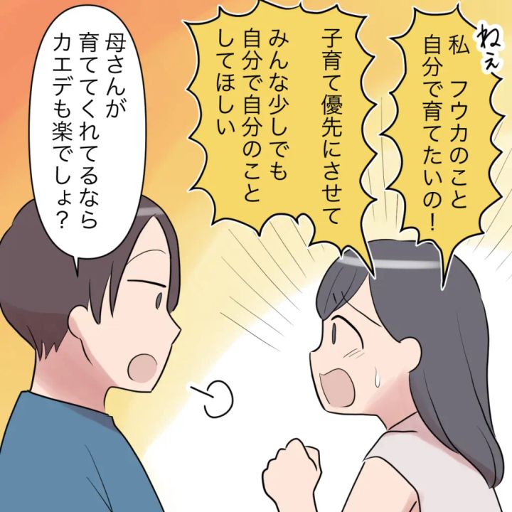 ユウタに「フウカのこと自分で育てたい」と訴えても、「母さんが育ててくれてるならカエデも楽でしょ?」と全く相手にしてくれないユウタ。自分の事を自分でするという簡単なことなのに、まるでわかってもらえません。