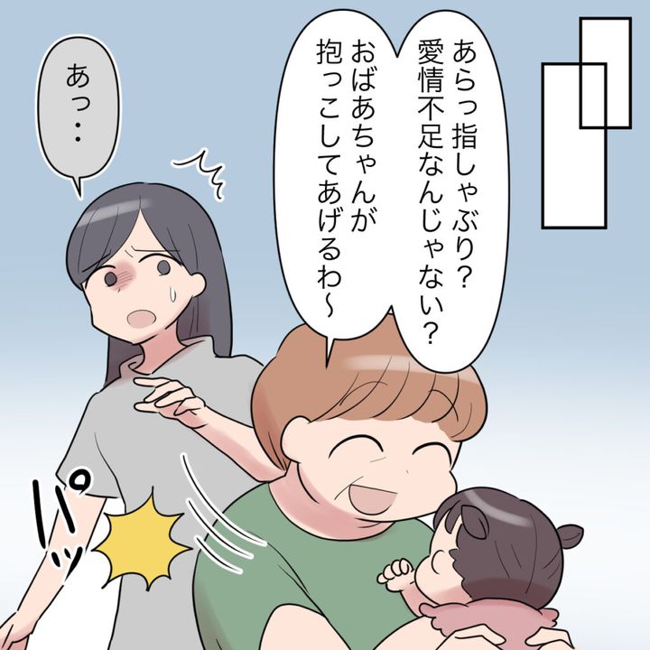 フウカはすくすくと成長し、笑顔を見せるようになって一番かわいい時。抱っこしてフウカをあやす最高の瞬間も、すぐに義母に奪い取られました。ちょっとでも指しゃぶりをしようものなら「愛情不足」と言われ、「おばあちゃんが抱っこしてあげるわ~」と言って私から引き離すのです。