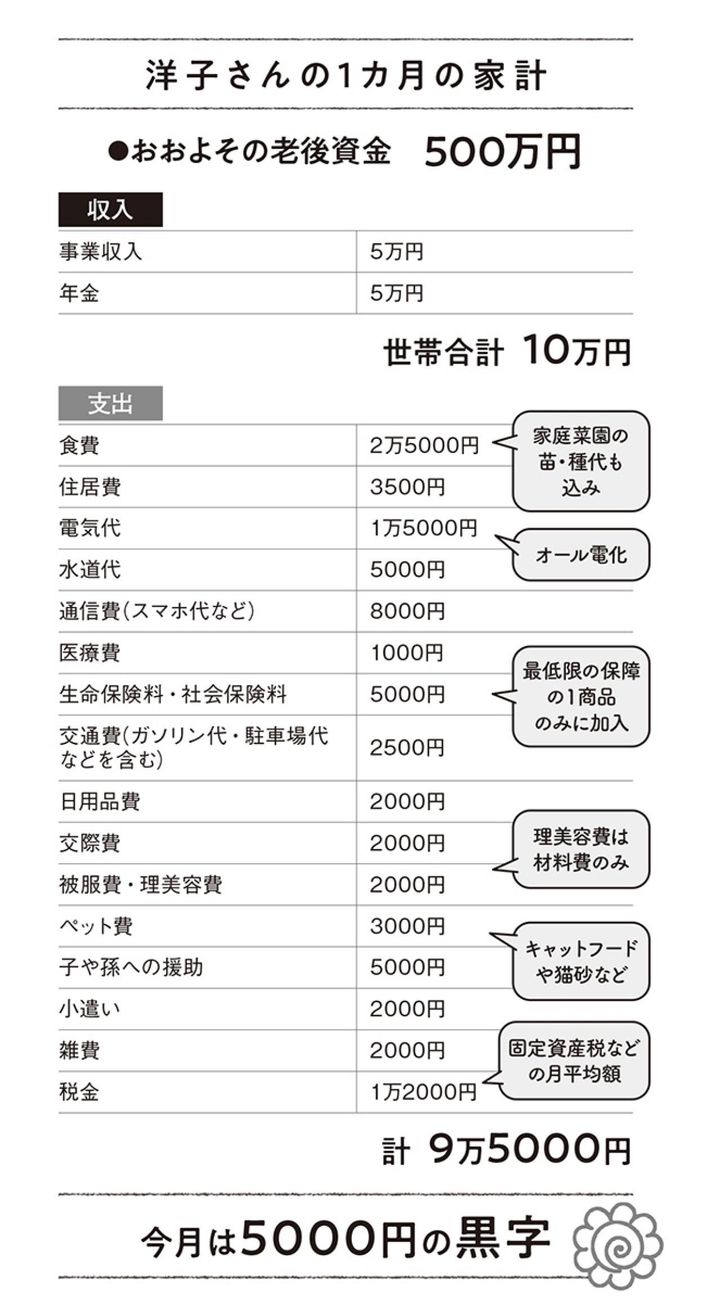 「庭でいろんな種類の野菜を育てて調理し、雨水を水やりに使うなど、工夫を楽しみながら出費を抑えています」という洋子さん。年金と自宅で営む美容院の収入の合計10万円に対して、毎月5000円の黒字!