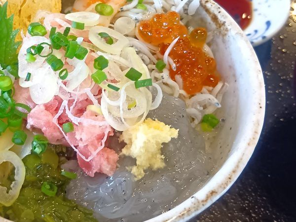 見てください! 新鮮だからこその、つやつやでプルプルの透明感。口の中でとろりと溶け、ほんのり甘さもあり。 イクラや釜揚げしらす、ねぎとろも旨々。それぞれの味わいが融合して、美味しさ最高潮です。