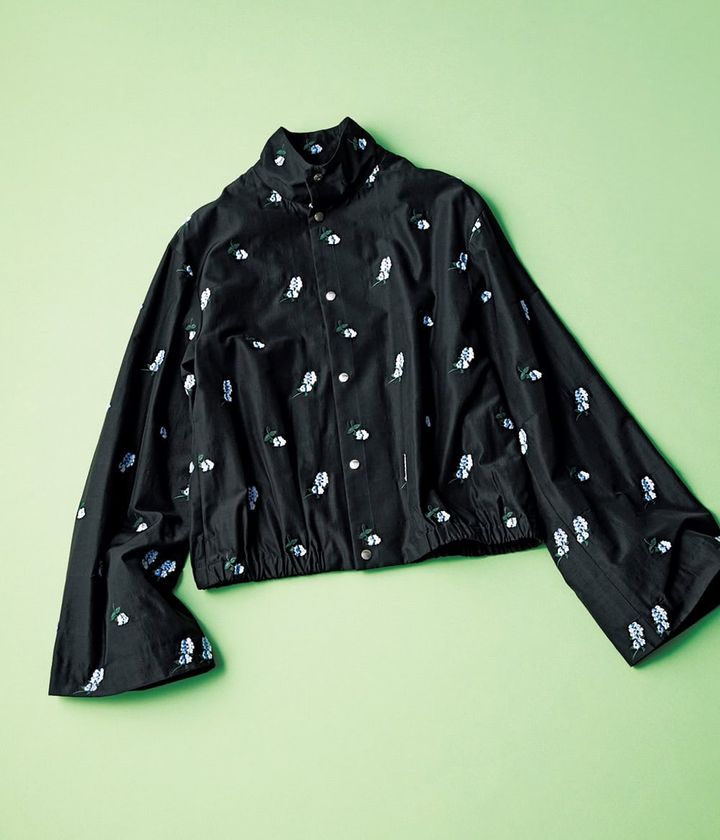 マニッシュなブルゾンと刺繍の組合わせが新鮮。幅広の袖に女らしさが宿ります。ジャケット(ロエフ/エイチ ビューティー&ユース)