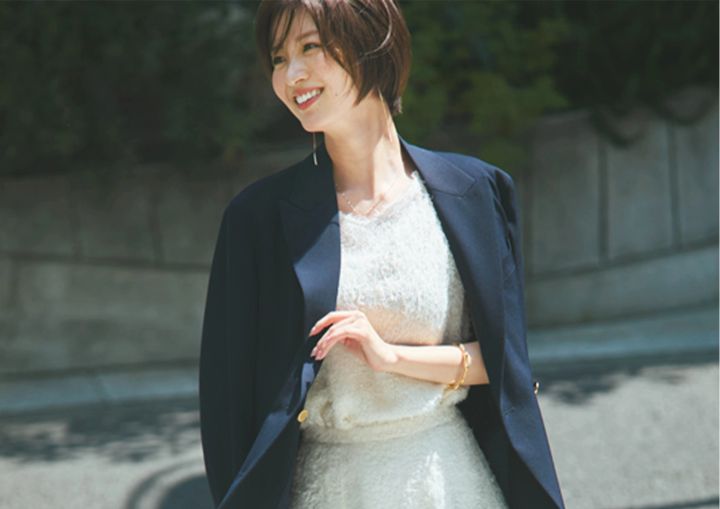 やわらかな毛流れのニュアンスが、甘い表情をメイク。トラッドなダブルのジャケットは、ほどよくボクシーなシルエットだから秋のレイヤードコーデも楽しみやすいというメリットが。