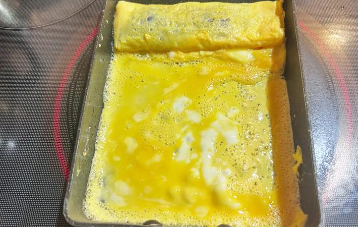 巻いた玉子は奥側に寄せ、再度玉子焼き器に卵液を薄く流し入れて同じように巻きましょう。