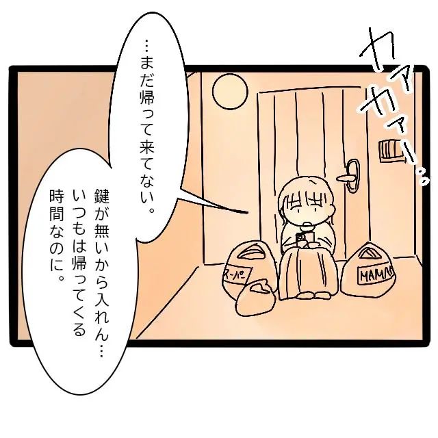 いつもならとっくに帰ってきている時間なのに・・・私は一向に既読にならないメッセージを見ながら途方に暮れます。義実家の鍵を持っていない私は中に入れないので、仕方なく玄関前に腰を下ろして義母たちの帰りを待つことにしました。