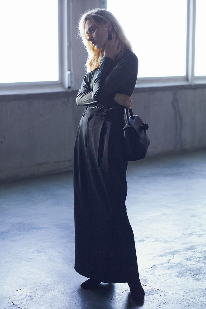 装飾も形によるメリハリもなくし、平坦にするほど引き立ってくるのが、黒という色が持つ本来の強さ。なにと組み合わせてもどんな着方をしても凜とした表情を保てる堂々たる佇まいは、ごくシンプルな装いにも自信を与えてくれる。