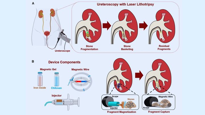 アメリカのスタンフォード大学で行われた最新の研究により、尿管結石を細かく砕いた後にどうしても残ってしまう小さな破片を、磁気を帯びたゼリーを利用して一気にまとめて回収できる新しい方法が開発されました。