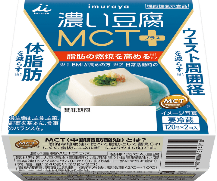 脂肪の燃焼を高め、体脂肪や腹囲を減らす効果が報告されているMCT(中鎖脂肪酸)が配合されたお豆腐です。MCTは無味無臭なので、普通の豆腐と同じように食べられます。
