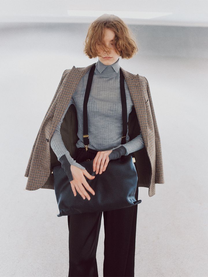グレータートルネックニット/チノ(モールド) ブラウンチェックジャケット/マディソンブルー 黒サテンパンツ/LE PHIL(LE PHIL NEWoMan 新宿店) バッグ/PUNTI.(エルディスト ショールーム) インナー、サスペンダー/スタイリスト私物