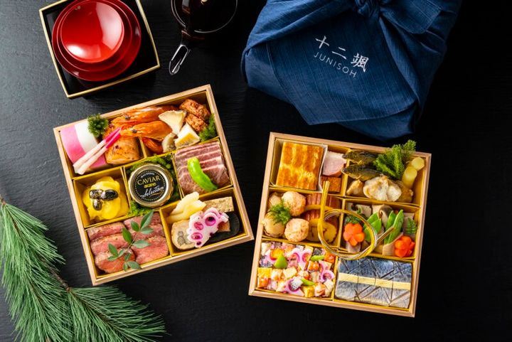 日本料理「十二颯」料理長監修による会席、寿司、鉄板焼3名の料理長が贈る二段重のおせち。伝統的なおせち料理に加え、〆鯖棒寿司や鉄板焼で仕上げる豪華神戸牛ローストビーフ、さらにキャビアなどが加わり、華やいだ新年の食卓を贅沢に演出します。