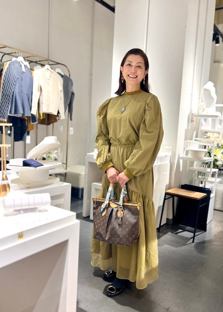 ご家族と一緒に、京都の新風館でショッピングを楽しんでいらしたTOMOKOさん。アーシーなカーキのワントーンコーデは、大阪のブランド「リッシュデコ」のもの。「ワンピースに見えると思うんですけど、セットアップなんです。ギャザーがたっぷり入ったシルエットで、これだけで着こなしが決まるのでとても気に入っています」。