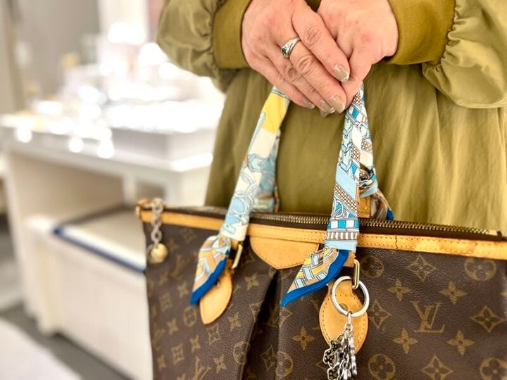 「何年持っているか、もう忘れてしまったけれど、まだまだ大切に使いたいから」と、持ち手にご自身で丁寧にスカーフを巻きつけた「ルイヴィトン」のパレルモ。爽やかなブルーでペンダントとカラーリンク。