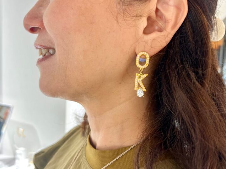 「O K」のアルファベット2文字がクリスタルで輝く、ユニークなピアス。「元気をもらうために身につけます。私にとっては運気を上げるお守りのようなジュエリなんです」。思わず笑顔になるような、会話のきっかけになるような。大人ならではのチャーミングさも漂います。