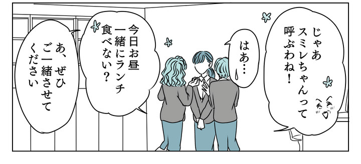 ランチに誘われ、その日は3人で一緒に食事。でも先輩ふたりは資料提出やゴミ捨てまで3人一緒に行動しようとするのです。極めつきは帰りに「出社も退社も待ち合わせて一緒にしよう」と言ってきたのです。違和感を感じたスミレさんがある日、ランチを断ったところ、突然無視をされるように……。
