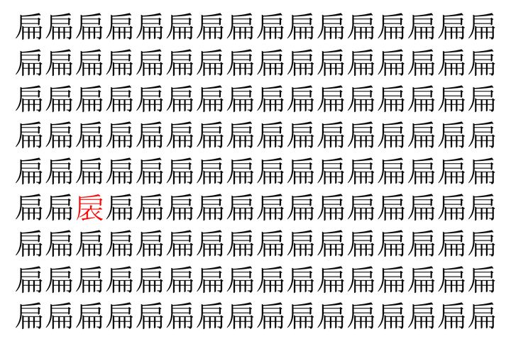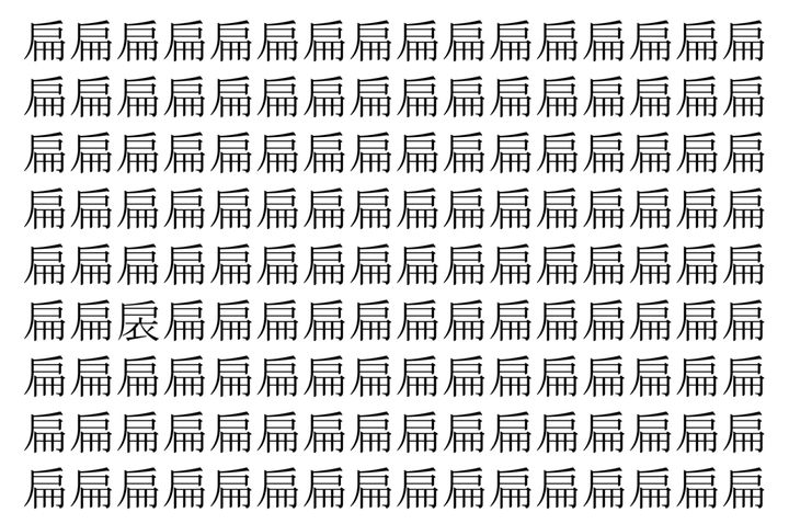 画像の中には、「扁」という漢字が縦に9行、横に16個並んでいます。 全部で144個となりますが・・・、そのうち1つは「異なる漢字」となってますよ!!