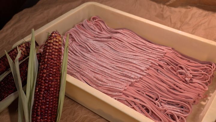 そして、野菜にも奈良発祥の食材、赤い実が特徴のトウモロコシ「大和ルージュ」を使用。一部でも実がなっていないトウモロコシは規格外野菜となるが「規格外のトウモロコシから出汁を取って作っております」と中野さん。大和ルージュを髭や芯まで煮出した出汁を加えることで、ボロネーゼの旨みが引き立つのだとか。高橋さんは「形が違うだけで規格外に扱われるのはもったいないなと思っていた」「すごく素敵です」と話す。さらに、モチモチの麺にも大和ルージュを練り込んで風味もアップ。