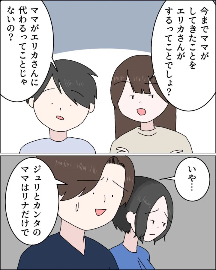 「今までママがしてきたことをエリカさんがするってことでしょ?」ジュリがそう言うと、「ママがエリカさんに代わるってことじゃないの?」とカンタが言い、「いや・・ジュリとカンタのママはリナだけで・・」と夫が言いました。
