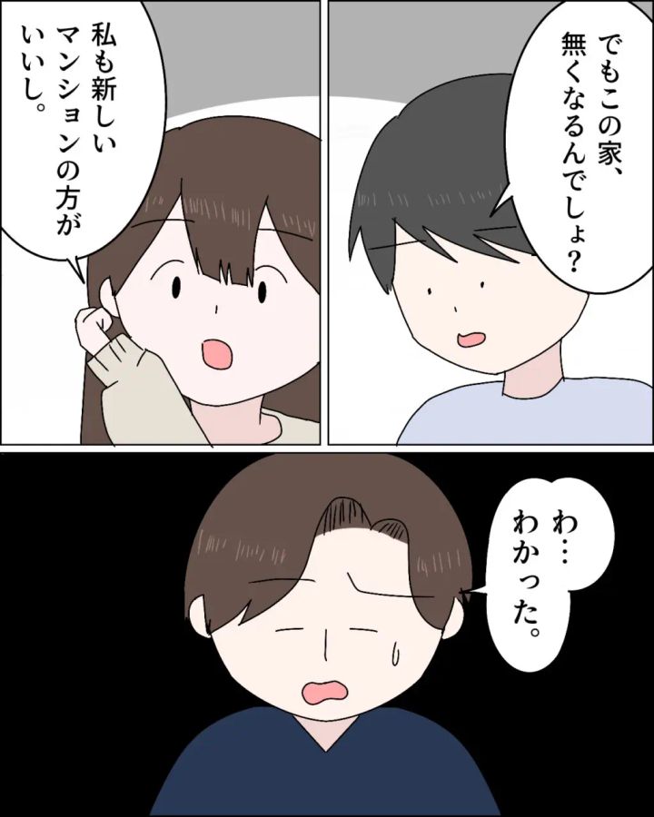 「でもこの家、無くなるんでしょ?」カンタがそう言うと、「私も新しいマンションの方がいいし」ジュリもそう言い、「わ・・わかった」と諦めたように夫が答えました。