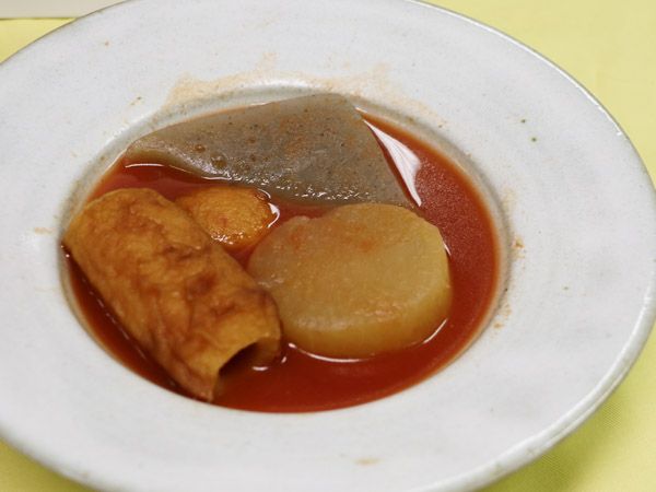 基本は焼きあごをベースにした出汁。そこにトマトの酸味や甘みを調整しながら濃度を変えていったのだそう。こだわったという具材も、こんにゃく・ちくわ・大根・小判天・野菜天が入っていて、大満足の量。特に大根の厚さには驚きました! 分厚いのにやわらかくて出汁もしみていて、これが煮込まずにすぐに食べられるというのは魅力的です。