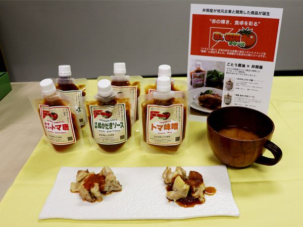 新商品は、北九州産のトマトを使用して開発されたもの。調味料からスイーツまで幅広いジャンルのものが並んでいました。