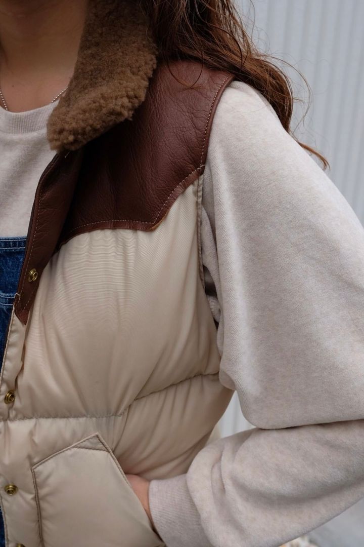 「RHCで初めて、ロッキーマウンテンフェザーベッドとのコラボレーションしたベストがお気に入りです。2018年を最後に生産がされていない、レディースヨークのダウンベスト『クリスティ ベスト(CHRISTY VEST)』を再現して復刻したものです。ボディとコントラストを効かせたRHCならではの配色が、遊び心をくすぐります♡」ベスト¥94,600(Rocky Mountain Featherbed/RHC Ron Herman)