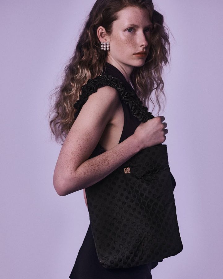トップバッターは、モードでありながらどこかエレガントなトートバッグ「giggle tote bag」。シックなドット柄が淑女な印象を与えるこのトートは、繊細に寄せられたギャザーのショルダーが冬のシンプルな装いにさり気ない甘さをプラス。