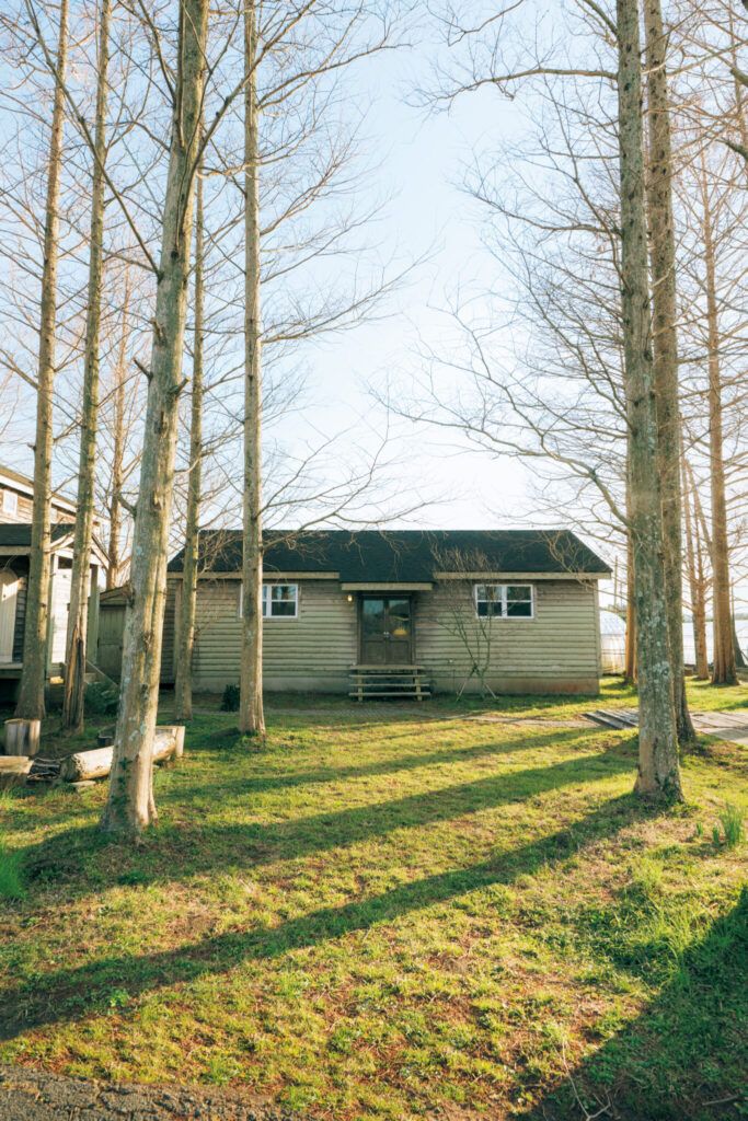 メタセコイアの木立があったことから、ここへの移住を決めたという。レッドシダーを使った木造の平屋を店にしている。