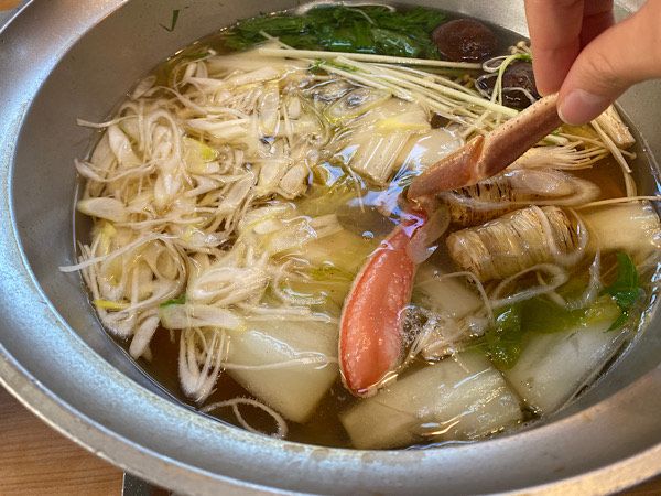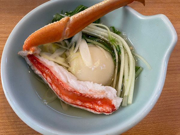 蟹をしゃぶしゃぶして出た旨味の溶けたお出汁できしめんを茹でます。蟹の旨味がたっぷり染み込んで、締めまで最高の味わいです。