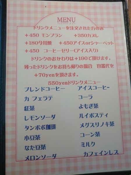 ドリンクメニュー(全種類550円)はいっぱい種類があります。なんと昔はもっと多かったそうです。ドリンクを注文した方のみ、注文できるデザートもあります。