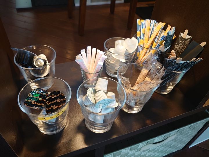 黒蜜、キャラメル、ミルク、ブラウンシュガー、シロップを自由に加えて、甘さやミルクの量を調整できます。それにしても甘味のバリエーションの多さよ。