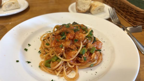 こちらが「パスタAセット 浅利と秋茄子、つる紫のアラビアータスパゲティ」。