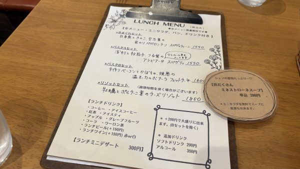 お邪魔した土曜日は、ランチが4種類ありました。全てのメニューにミニサラダ、パン、ドリンクが付いています。そして、この日は無料でミニサラダを具だくさんミネストローネに変更することもできました。