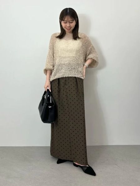 ブラウンのベースカラーに、黒の小さなドット柄が入ったロングスカートは、ほんのり甘めで上品に決まります。大人が着られるフェミニンなアイテムをお探しの方にもおすすめです。