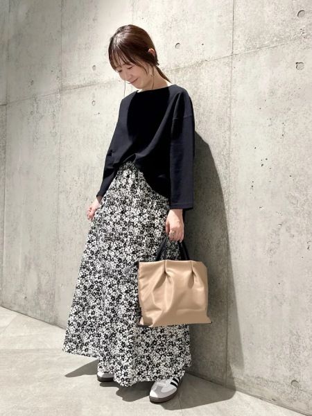 総柄のロングスカートの中でも、小さなフラワープリントのデザインは、幅広い年代に常に人気の一枚。中でも白や黒など、モノトーン系のものがトップスの色を選ばず合わせやすく、長い期間着まわしも楽しめます。