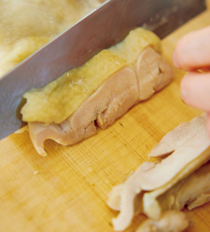 鶏肉は切らずに蒸して、うまみとしっとり感をキープ。繊維を断つようにそぎ切りにすれば、歯ざわり柔らか。