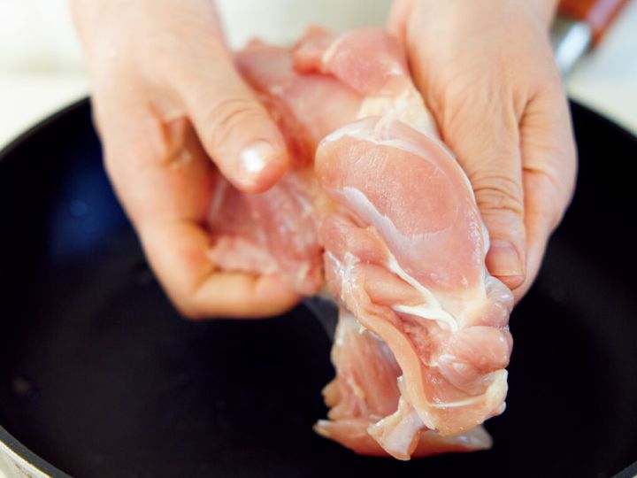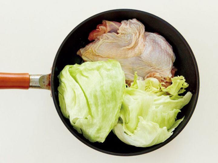3. 蒸し汁までうっま...!鶏ももとレタスをフライパンで蒸すだけ『ジューシーよだれ鶏風』