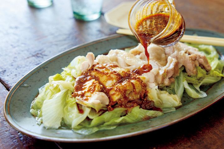 鶏もも肉とレタスをフライパンで一緒に蒸すだけで、しっとりジューシーに。黒酢の酸味とラー油の辛みが食欲をそそる、よだれ鶏風の一皿です。