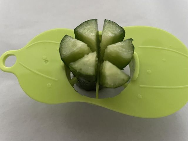 ぎゅっと押すだけで簡単にきゅうりをカットできます。スティック野菜やサラダにおすすめ。