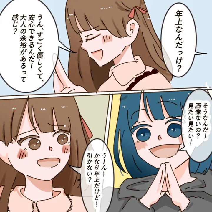 「年上なんだっけ?」と聞くと、「うん、すごく優しくて安心できるんだ!大人の余裕があるって感じ?」アイさんの言葉に、「そうなんだ~!画像ないの?見たい見たい!」サキの言葉に、「うーん・・かなり年上だけど・・引かない?」アイさんがそう答えました。