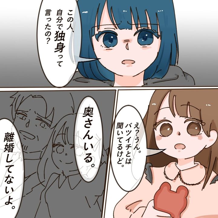 「この人、自分で独身って言ったの?」と聞くと、「え?うん。バツイチとは聞いてるけど」アイさんの言葉に、「奥さんいる。離婚してないよ」サキが答えると、