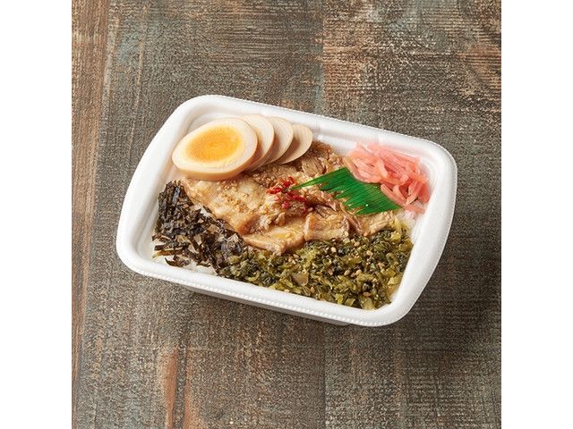 甘めのタレを絡めた直火焼のチャーシューとごま高菜・ゆでたまごを盛り付けた小容量のチャーシューごはんです。 ※静岡県の一部、宮崎県、鹿児島県では取り扱いがございません。