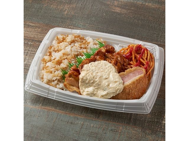 甘辛いタレをかけた鶏から揚げと厚切りハムカツをタルタルソースで食べるボリューム感のある商品です。