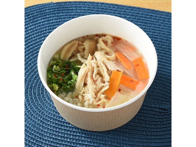 白米ともち麦をブレンドしました。鶏の旨み・コクをしっかりと感じるスープです。鶏肉・大根・人参などを入れて具量感を出しました。しょうがを入れて風味をアップしました。 ※茨城県、栃木県、群馬県、埼玉県、千葉県、東京都、神奈川県(一部除く)での取り扱いです。