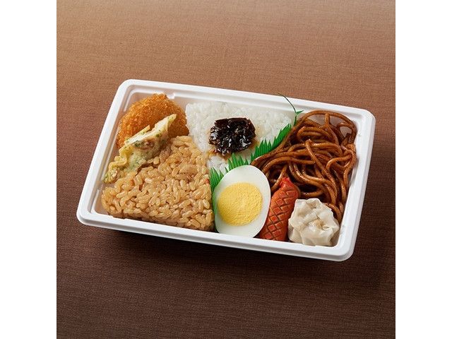 炊き込みご飯と昆布の2種類のおむすびに焼そばと人気のおかずを組み合わせたおむすびセットです。おかずは、赤ウインナー・コロッケ・ちくわ磯辺天・シューマイ・ゆでたまごです。