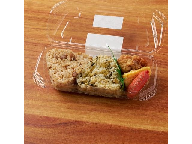 鶏めしと辛子高菜おむすびを組み合わせたおむすびセットです。おかずにウインナー・たまご焼き・あごだしから揚げを詰めました。 ※宮崎県、鹿児島県では取り扱いがございません。