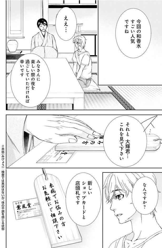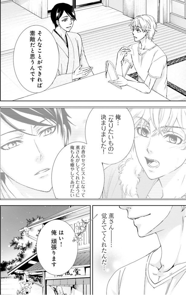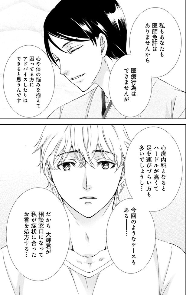 家族が病院を経営している瀬戸大輝は義務感で医師を目指していたが、二度目の医学部受験に失敗。これ以上、親に迷惑はかけられない…と絶望感にさいなまれていたとき、香老舗の若主人・栄薫に出会う。薫のお店に招かれた大輝は部屋に漂う香りに癒されてお香の魅力を知り、“お香のセラピストになって人を癒したい”という自分の夢を見つけるのだった。薫の元で香の道を学ぶ決意をした大輝は新たな人生を歩み出す――。京都を舞台に描かれる“お香”が紡ぐヒューマンストーリー『京の都の香の路』(全3巻)を好評につき再掲載でお届けします!
