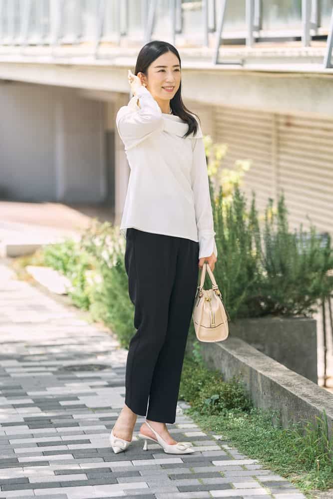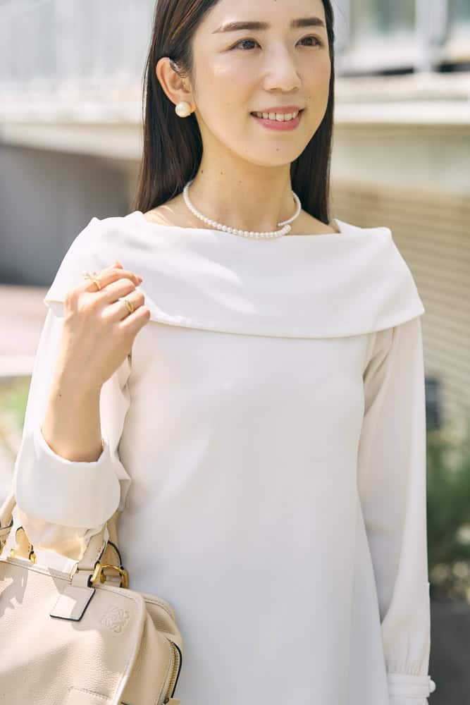 提唱者タイプらしく、ファッションでも自分の世界観を大切にしながら「やさしい誠実さ」を表現したいと思っています。ベースは落ち着いたモノトーンが多いですが、そこに少し甘さを感じるオフショルブラウスや、柔らかな輝きを添えるパールを取り入れて、エレガントで優しげなニュアンスをプラス。シンプルでありながらも、自分らしさをさりげなく表現できるように意識しました。