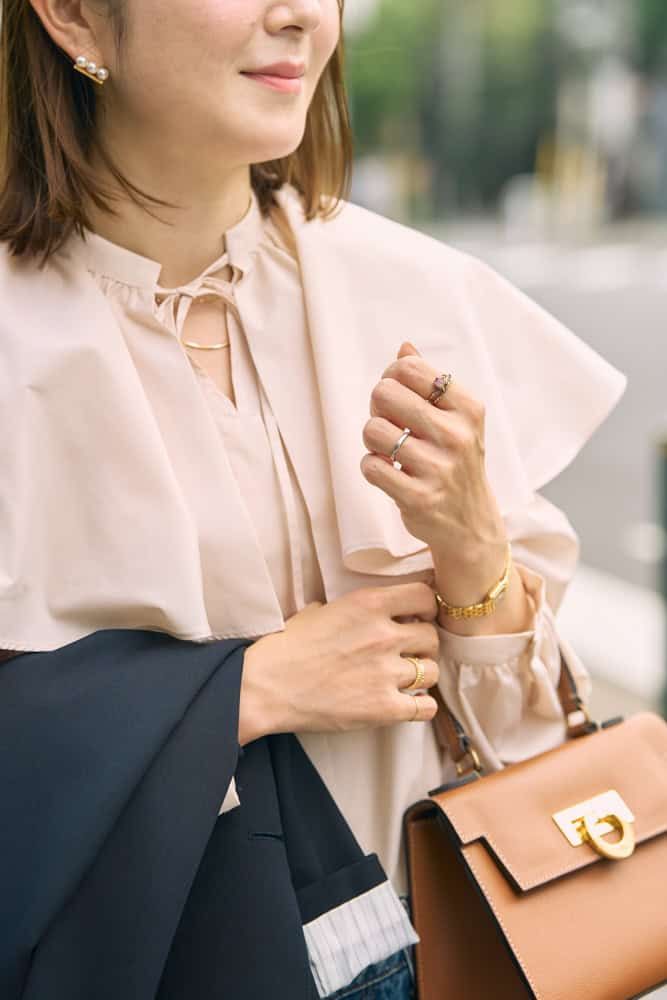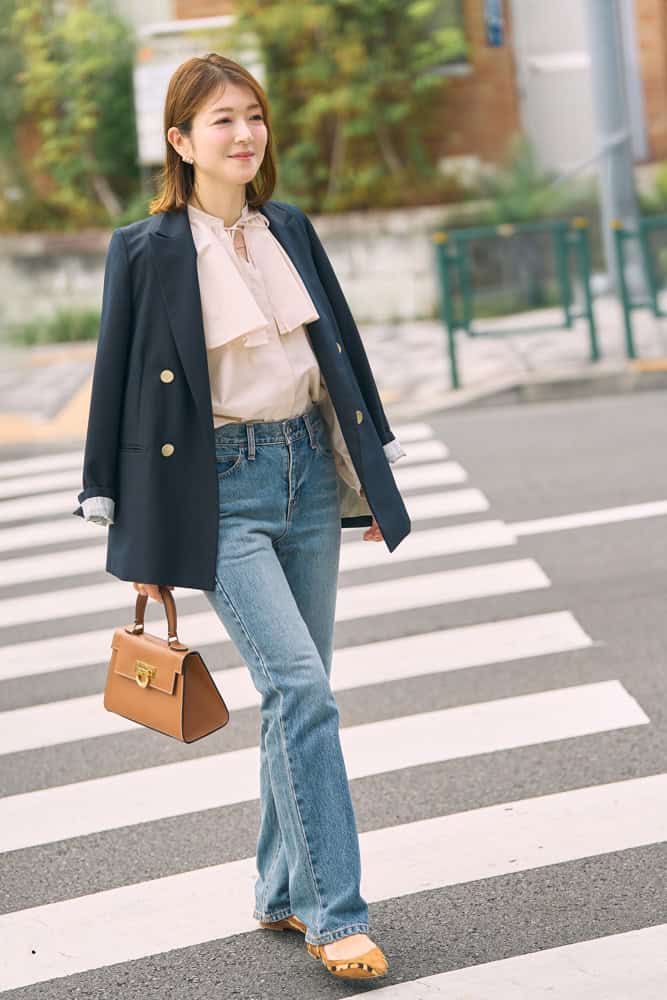 もともと穏やかな性格で、ファッションもシンプルで上品な雰囲気が好きです。でも、自分だけのこだわりは大切にしたくて、さりげなくコーデに反映させています。今回のこだわりは、ブラウスの大胆なフリル使い。デニムと合わせて程よくカジュアルダウンさせ、ジャケットで全体を引き締めました。バッグと靴をブラウンでまとめて、柔らかな印象に。耳元のパールが、タイムレスな優雅さを演出してくれます。