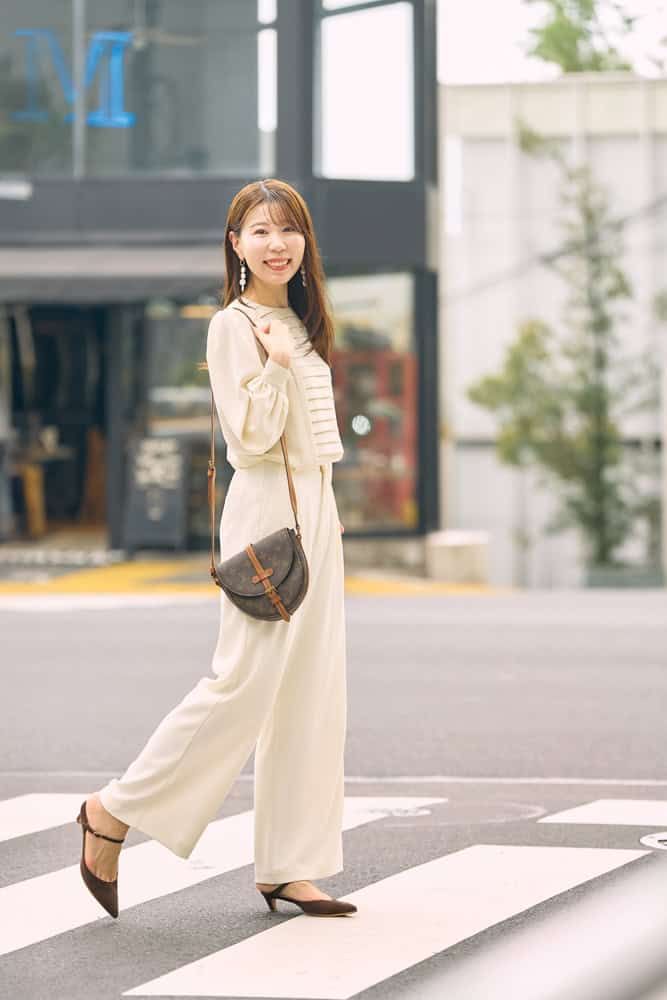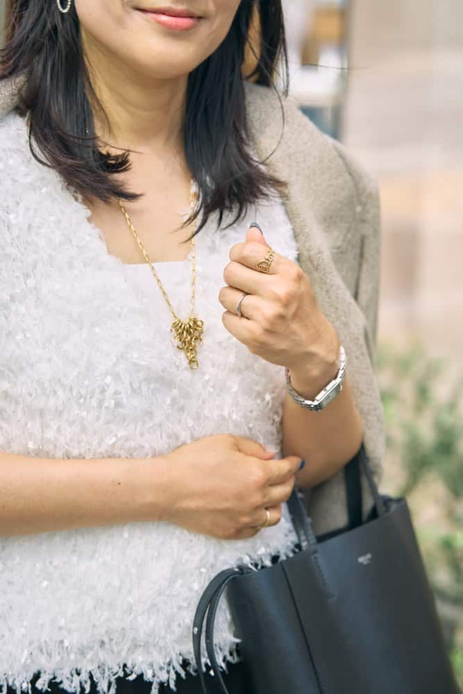 性格は、空気を読んで周りに合わせるところがあり、ファッションもTPOを重視して、その場になじむようにコーディネートを考えます。今日は代官山で友達とちょっといいランチをする予定なので、優しげなイメージのオールホワイトコーデにブラウンのバッグを合わせて秋らしく。主張の強いカラーアイテムは少し苦手で、普段から淡いトーンでまとめることが多いです。リングは全て、友人が手がけるブランド「kose」のもの。