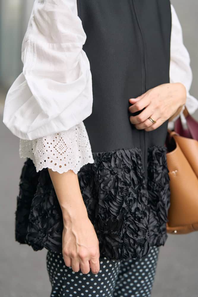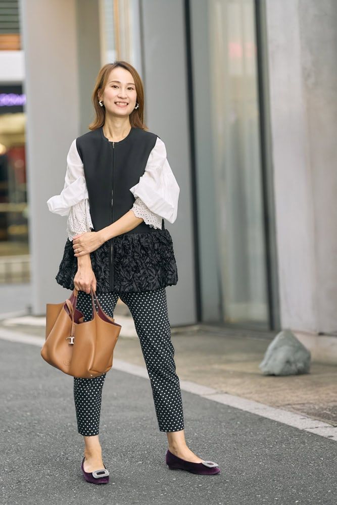 本来の性格は起業家タイプで、着回しはあまり考えず、直感で「好き!」と思ったものを買っています。オシャレな友人が集まる女子会では、トレンド感を意識しつつ、好感度の高い“主人公”になりきります。レース×サテン×ドット柄と、好きなものをとことん詰め込みましたが、モノトーンでまとめることで全体がすっきり。ブラウンのバッグとパープルのパンプスを差し色にして、秋らしく仕上げました。