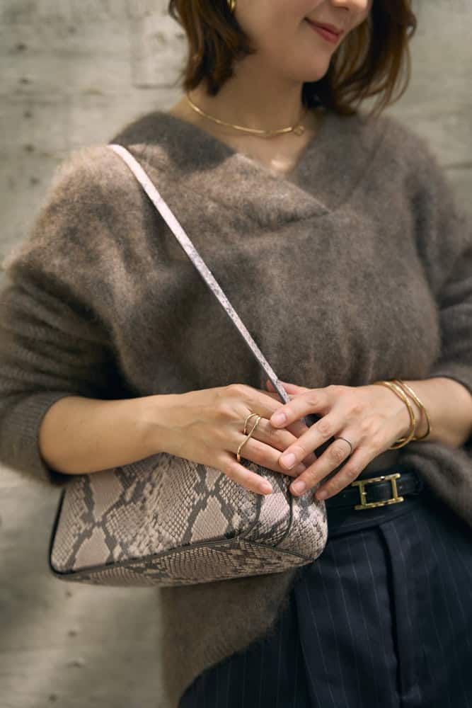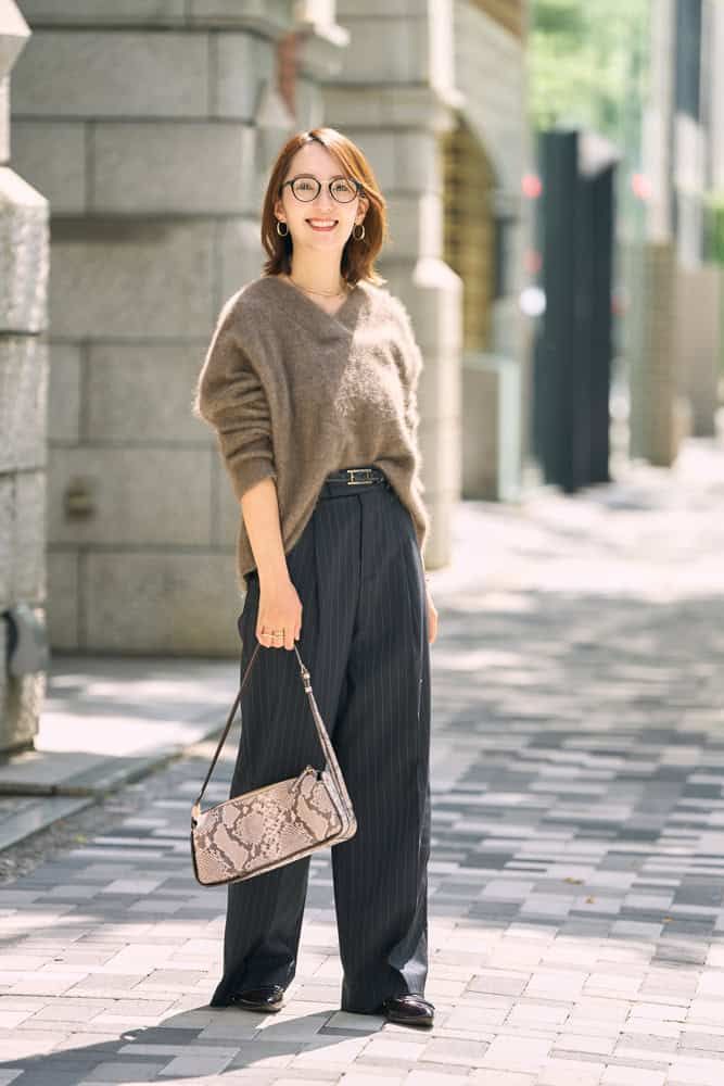 人間観察が好きで、空気を読むのが苦にならないタイプ。ファッションは“きちんと見え”を意識した、好感度重視のスタイルが基本です。でも小物は、人の目を惹くインパクトのあるアイテムが好き。モヘアのブラウンニットに、程よく緩さの黒のワイドパンツを合わせたシンプルコーデには、インパクト抜群のパイソン柄のバッグを投入。最後にメガネをかけて、全体のバランスを微調整しました。